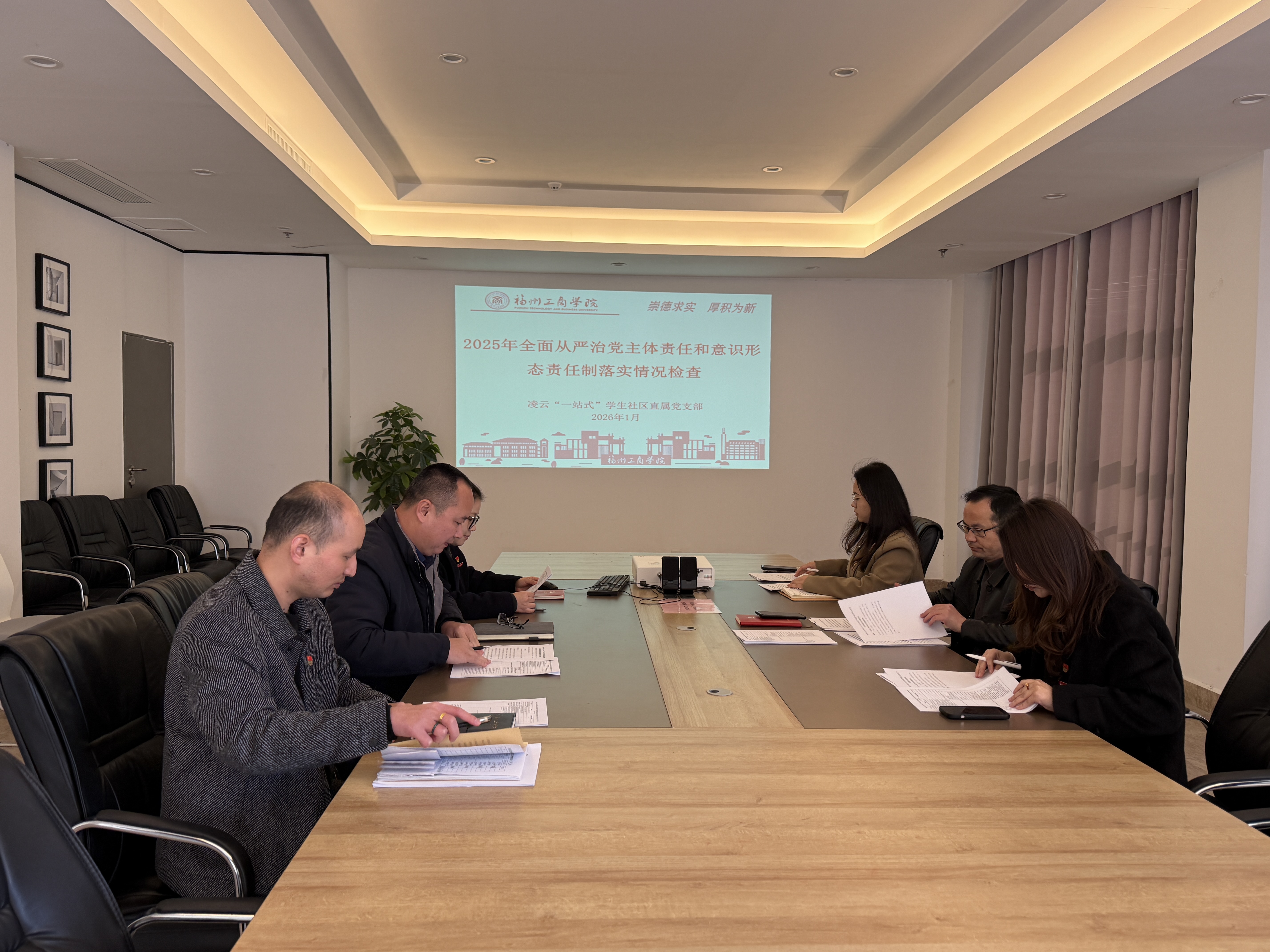 为贯彻落实党中央全面从严治党的战略方针,紧密围绕学校中心工作,聚焦管党治党政治责任,筑牢校园意识形态安全防线,扎实推进党建与业务相融合、双促进。1月7日,凌云“一站式”学生社区直属党支部召开2025年度全面从严治党主体责任和意识形态责任落实情况检查会。副校长王榕国、党委宣传部常务副部长黎明以及检查组成员莅临指导,会议由党支部书记高志勇主持。